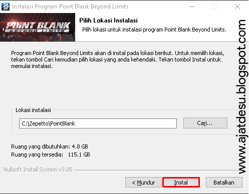- Nah, kemudian disini tentukan direktori instalasi Point Blank nya, saya sarankan untuk default saja, kemudian klik Instal dan tunggu proses instalasi