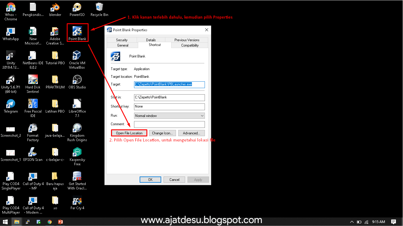 - Kemudian masuk ke direktori instalasi Point Blank sebelumnya, jika bingung mencari direktorinya Anda dapat klik kanan pada Shortcut Point Blank, kemudian pilih Properies, lalu pilih Open File Location