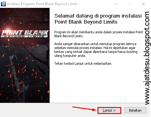 - Setelah itu Anda akan diarahkan ke tampilan Instalasi Point Blank Beyond Limits, klik Lanjut kemudian klik Saya Setuju