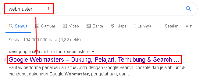 1. Ketikan Webmaster di Google, lalu pilih baris paling pertama.